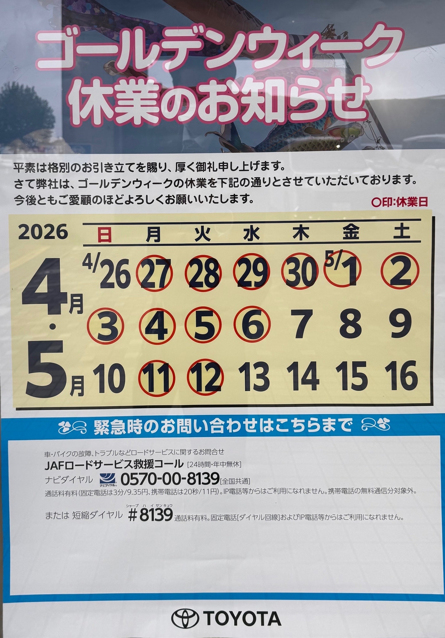 ゴールデンウイークの休業のお知らせです。